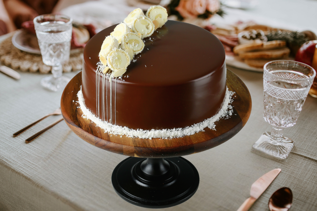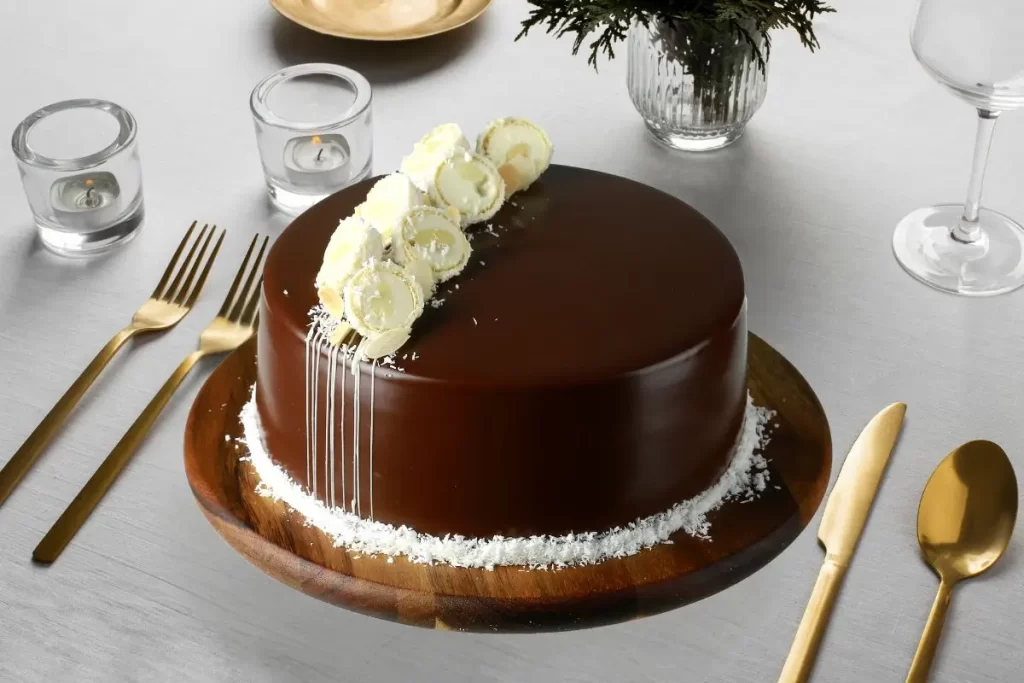Our Chocolate Raffaello Cake is made to perfection with a moist chocolate sponge filled with delicious coconut cream. Chocolate ganache in combination with shredded coconut, gives our Chocolate Raffaello Cake an irresistible taste, making it a bestseller. Message on the cake can be customized.