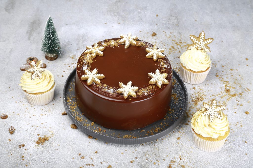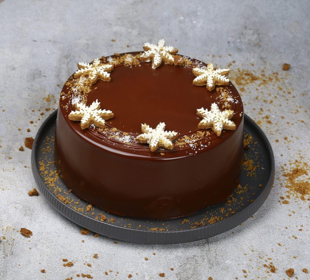 GingerBread Choco Cake is a rich chocolate cake coated in a glossy chocolate ganache and finished with festive gingerbread star cookies and cookie crumbs.