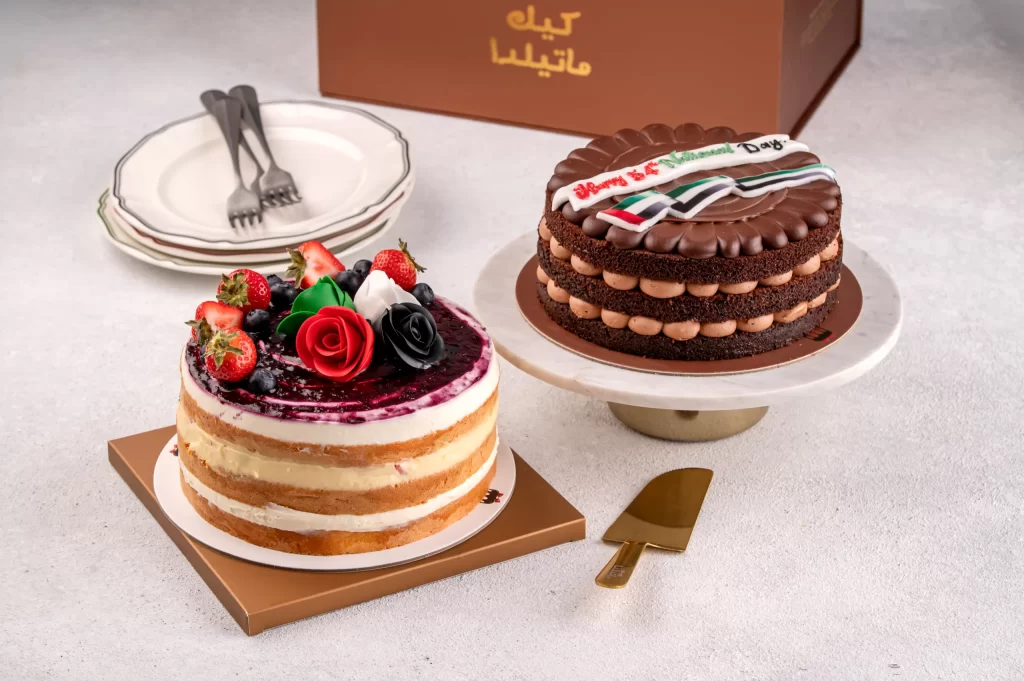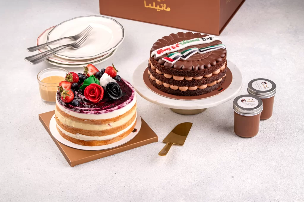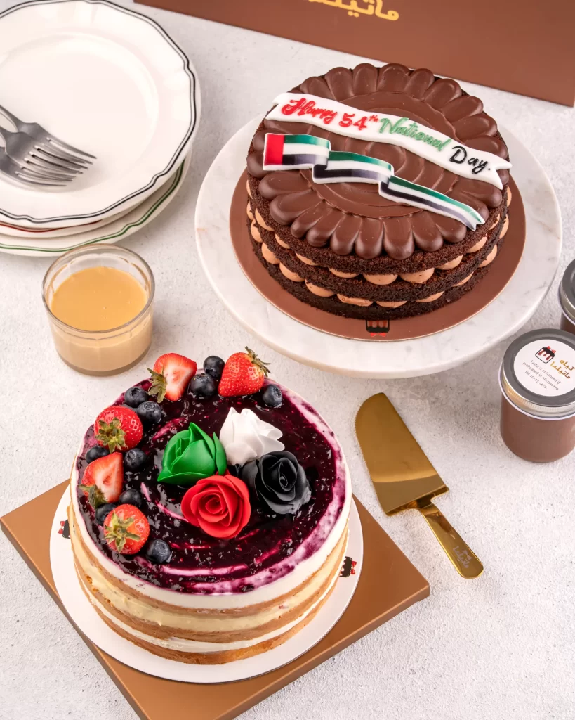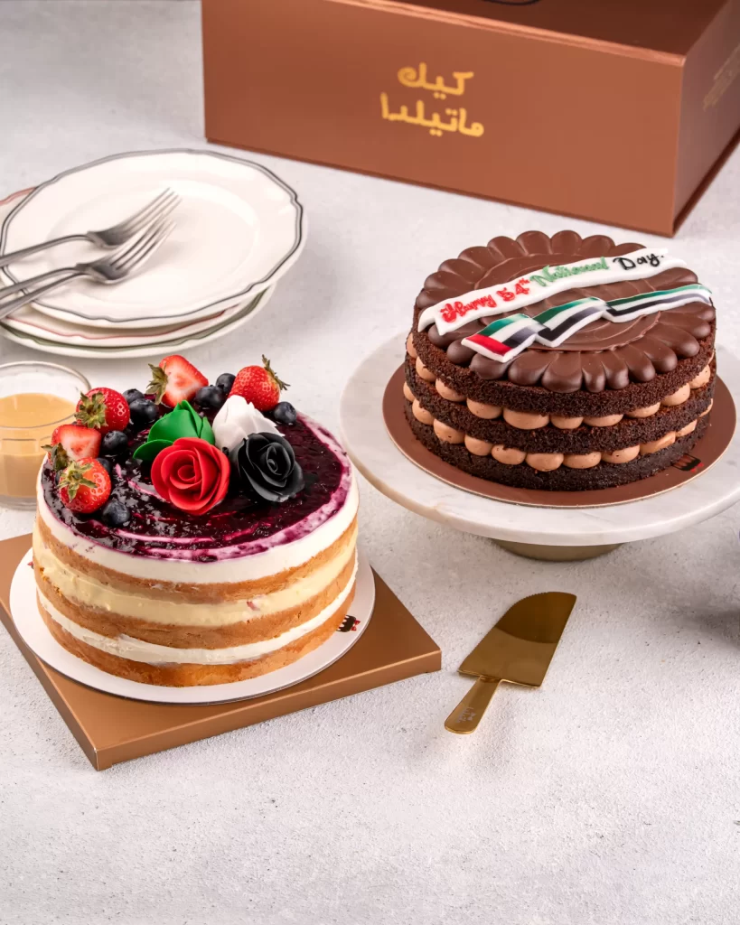 A delicious pairing of our rich Matilda Chocolate Cake and our fruity Berry Cake, beautifully decorated with UAE-themed colors. Perfect for gatherings, gifting, and National Day celebrations.