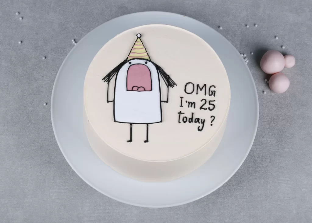 A humorous 25th birthday cake made for milestone birthdays. This custom message cake features a fun illustration and a relatable “OMG, I’m 25” theme, making it a popular choice for funny birthday cakes, quarter-life celebrations, and modern birthday parties.