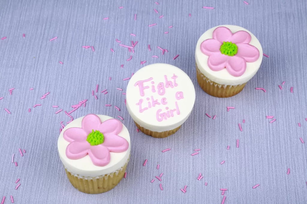 Matilda Cake’s Pink Flower Awareness Cupcake features a delicious vanilla or chocolate base topped with pink buttercream and a handcrafted pink fondant ribbon, symbolizing breast cancer awareness.