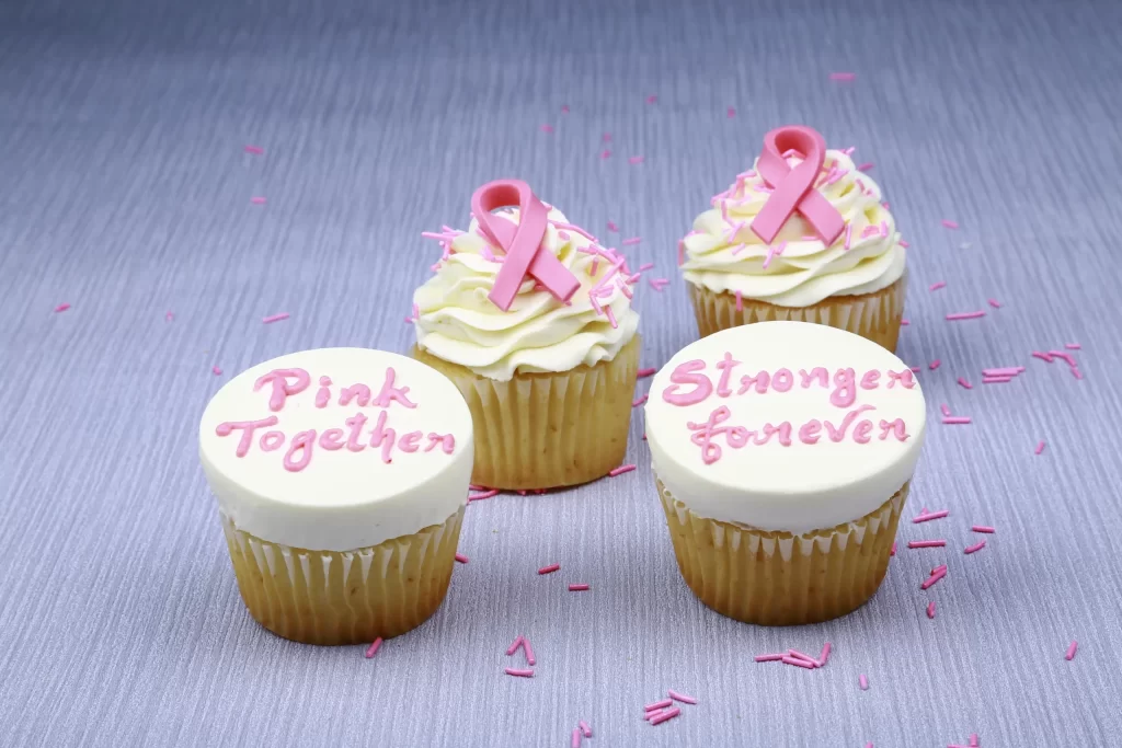 Matilda Cake’s Pink Ribbon Awareness Cupcake features a delicious vanilla or chocolate base topped with pink buttercream and a handcrafted pink fondant ribbon, symbolizing breast cancer awareness.