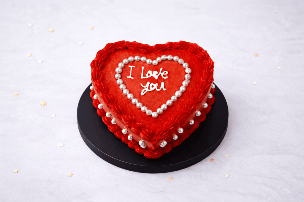 A sparkling heart-shaped cake with layers of vanilla, chocolate, and red velvet, topped with creamy frosting. Sweet, playful, and perfect for sharing love and indulgence.