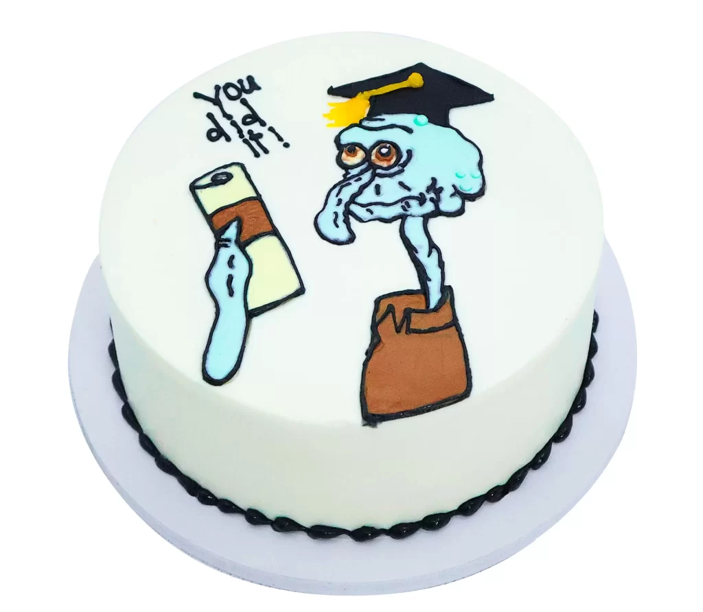 Celebrate this wonderful milestone with Matilda’s hand drawn Squidward Graduation Cake. Congratulate on this big day with freshly baked cake frosted and filled with delicious cream cheese, yet another joy for your loved one.