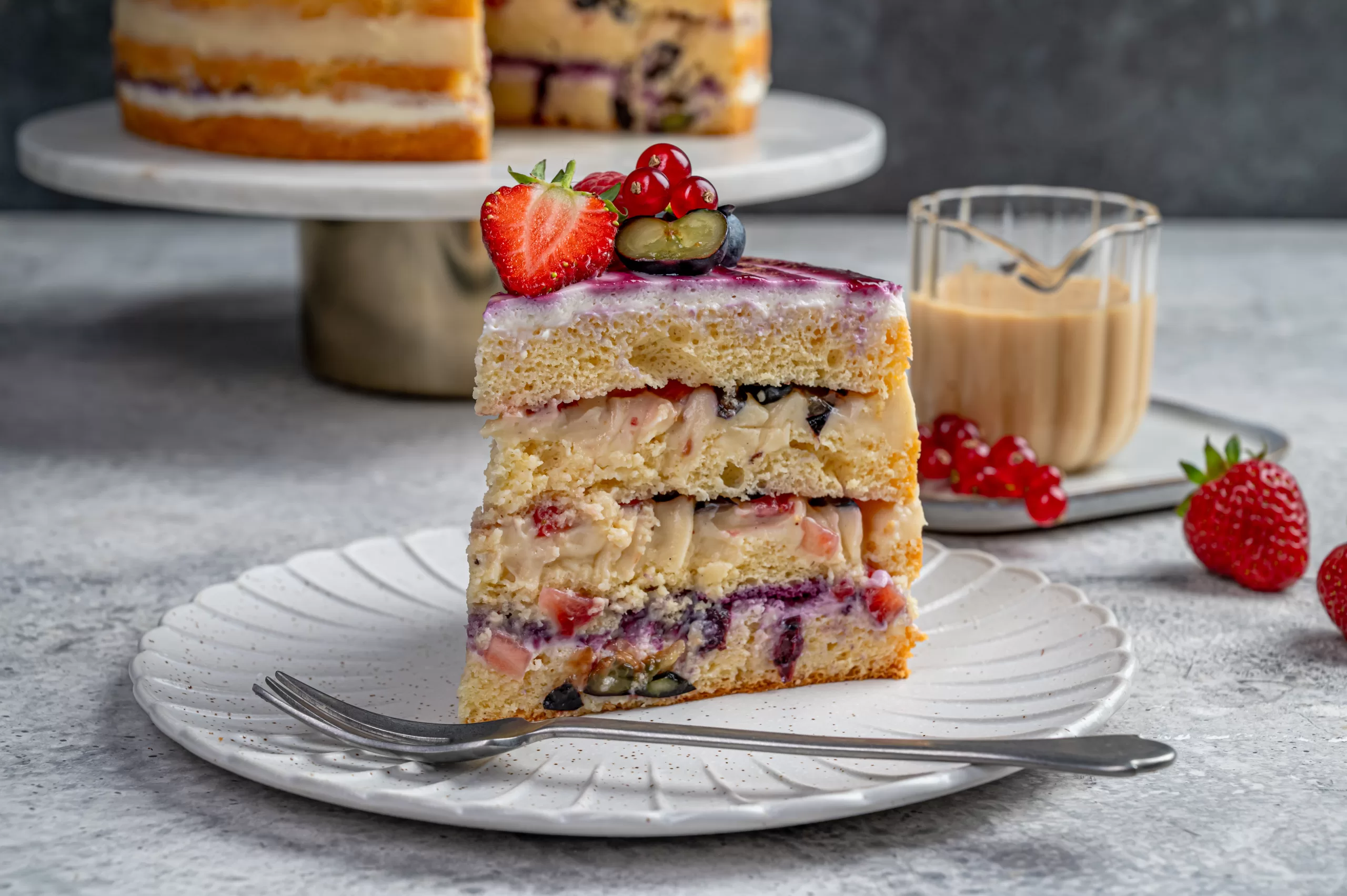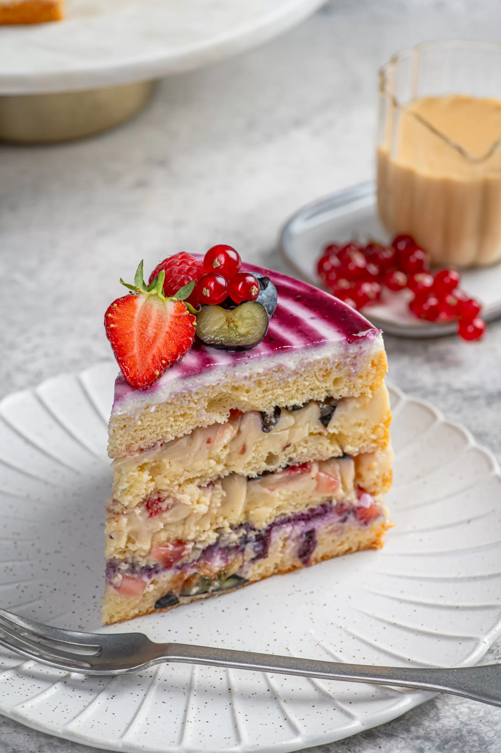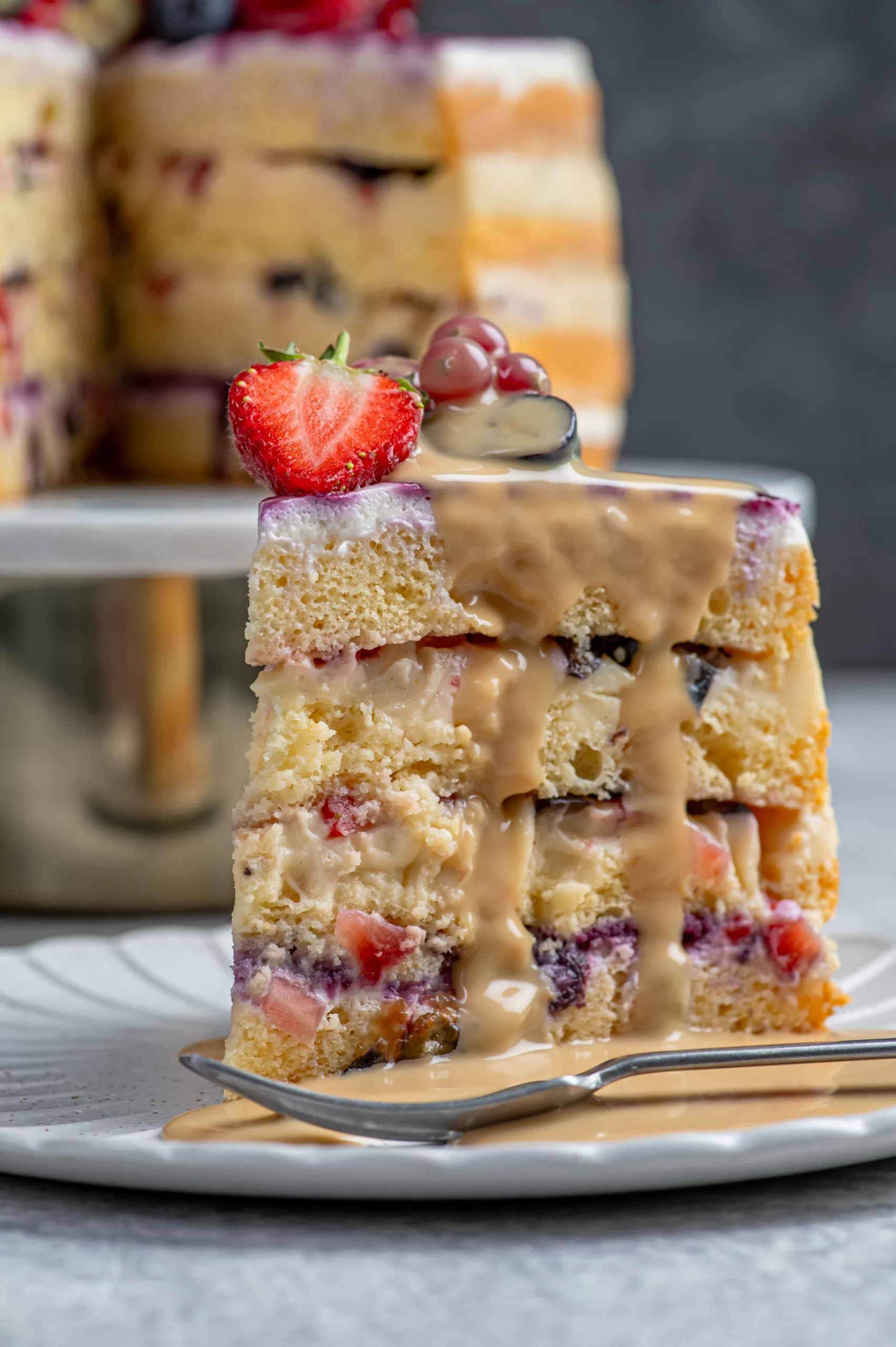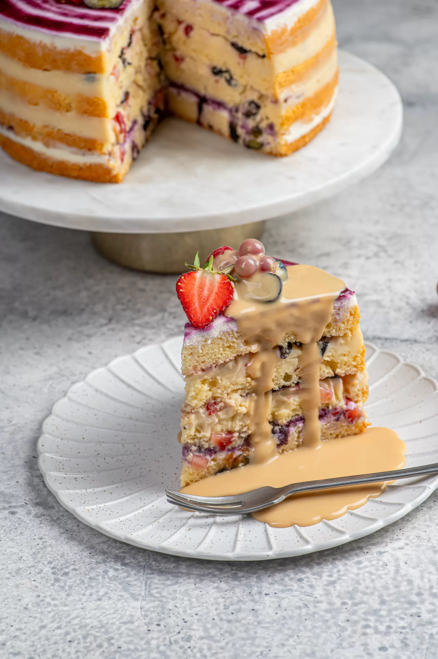 Soft and fluffy vanilla sponge layered with a mix of luscious fillings—one layer combines fresh berry jam with rich custard, while another features smooth cream cheese for a perfectly balanced taste. Finished with a luxurious drizzle of golden chocolate sauce, this cake is a true summer delight bursting with color, texture, and irresistible flavor.