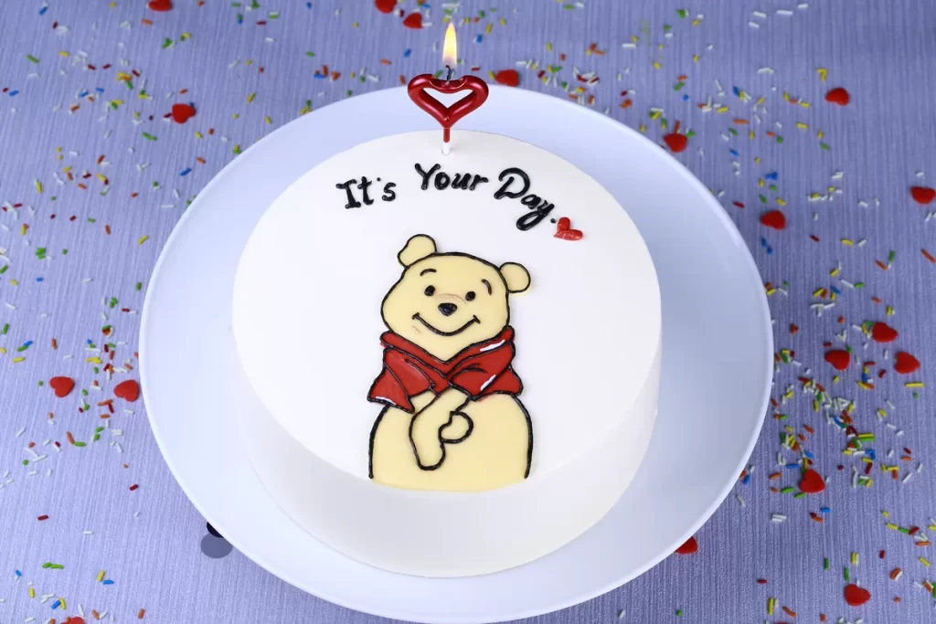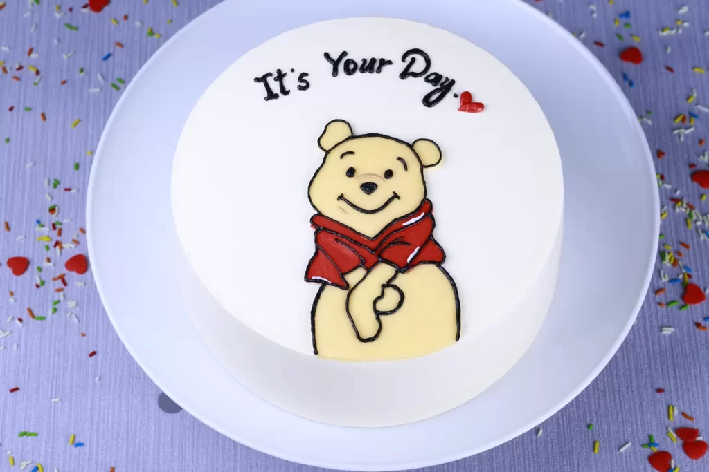 Step into a world of whimsy! The Winnie Pooh Cake features a handcrafted Pooh figure atop our creamy cake, making birthdays and celebrations truly magical.